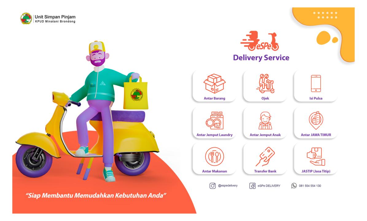 Espe Delivery merupakan salah satu produk jasa terbaru dari USP Minatani dalam memberikan kemudahan bagi anggota dan masyarakat sekitar.Espe Delivery MelayaniAntar Jemput Orang (Ojek)Antar Jemput Anak SekolahAntar Jemput LaundryAntar Jemput Barang dan MakananTrasnfer ke BankIsi PulsaJastip (Jasa Titip) Berlaku hanya hari-hari tertentuCara OrderHubungi Whatsapp Admin disini.